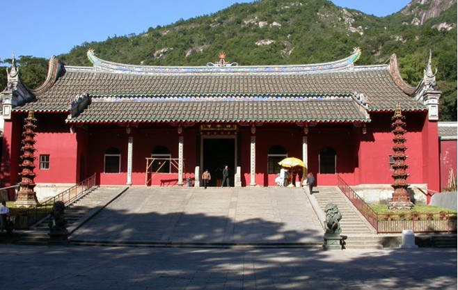 福州市鼓山涌泉寺為“閩剎之冠”,又是全國(guó)重點(diǎn)寺廟之一。寺建在海拔455米的鼓山山腰,前為香爐峰,后倚白云峰,有“進(jìn)山不見(jiàn)寺,進(jìn)寺不見(jiàn)山”的奇特建筑格局。相傳它的舊址為“華嚴(yán)寺”。唐建中四年(783年),有龍居靈源洞(《鼓山志》載:“其先為潭,毒龍居之。”),從事裴胄認(rèn)為“神物所蟠,宜寺以鎮(zhèn)之”,請(qǐng)高僧靈嶠入山誅茅設(shè)臺(tái)念《華嚴(yán)經(jīng)》,遂成華嚴(yán)寺,從此龍不為害?,F(xiàn)在,人們都把建中四年(783年)作為涌泉寺創(chuàng)建之始?!√莆渥跍绶饡r(shí),華嚴(yán)寺被毀。