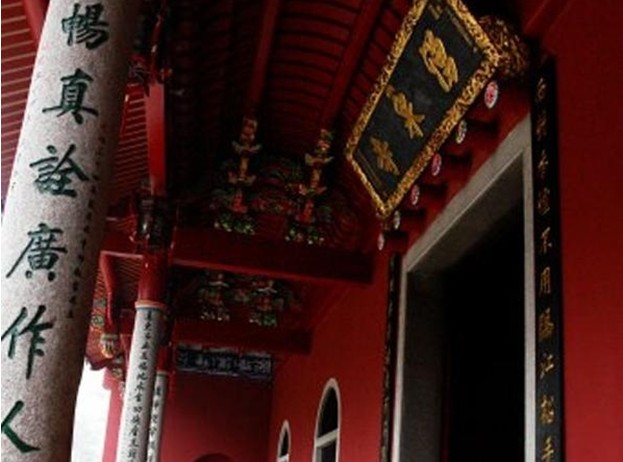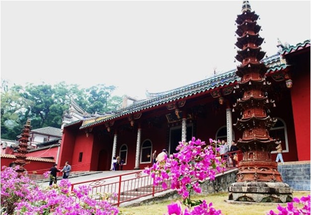 涌泉寺山門保留著唐朝建筑風(fēng)格,為一有框無門的空門,石門柱上鐫刻著一副短聯(lián):“凈地何須掃,空門不用關(guān)”。此聯(lián)構(gòu)思奇巧,意寓在涌泉寺山門東邊,有一石砌拱門,上書“靈源深處”。傍崖而下石階60余級,中裂一澗,寬約3米,深約10米,似石洞,故名“靈源洞”。版權(quán)所有山東聊城聊之旅國際旅行社有限公司,轉(zhuǎn)載必究!因?yàn)椤昂人畮r”石刻,這一帶又統(tǒng)稱“喝水巖”。靈源洞兩側(cè),薈萃了自宋以來摩崖石刻200多段,約占鼓山現(xiàn)存摩崖題刻的一半,行、草、隸、篆諸體俱備,猶如一座天然石刻書法寶庫,譽(yù)為“東南碑林”。題刻中有宋刻近百段,元刻12段,明刻30余段,清朝至今百余段,其中尤以宋代名書法家蔡襄的“忘歸石”,施元長的“喝水巖”以及理學(xué)家朱熹,民族英雄李綱和當(dāng)代郭沫若等題詠石刻最為著名