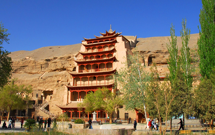 莫高窟(Dunhuang Caves)俗稱千佛洞,被譽(yù)為20世紀(jì)最有價值的文化發(fā)現(xiàn),坐落在河西走廊西端的敦煌,以精美的壁畫和塑像聞名于世。它始建于十六國的前秦時期,歷經(jīng)十六國、北朝、隋、唐、五代、西夏、元等歷代的興建,形成巨大的規(guī)模,現(xiàn)有洞窟735個,壁畫4.5萬平方米、泥質(zhì)彩塑2415尊,是世界上現(xiàn)存規(guī)模最大、內(nèi)容最豐富的佛教藝術(shù)圣地。近代發(fā)現(xiàn)的藏經(jīng)洞,內(nèi)有5萬多件古代文物,由此衍生專門研究藏經(jīng)洞典籍和敦煌藝術(shù)的學(xué)科——敦煌學(xué)。1961年,被公布為第一批全國重點(diǎn)文物保護(hù)單位之一。1987年,被列為世界文化遺產(chǎn)。