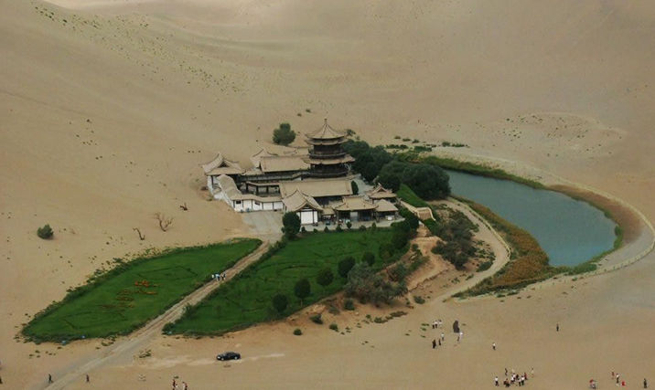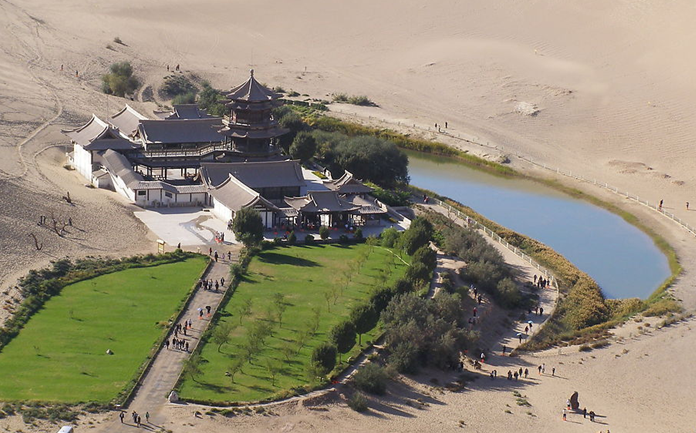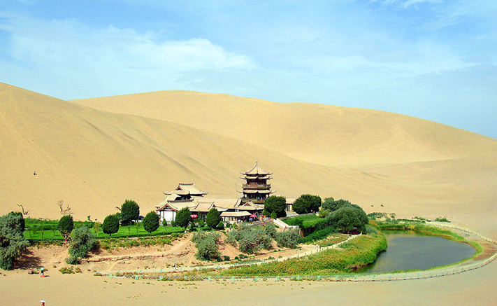 五十年代測(cè)量,月牙泉東西長218米,中斷最寬處54米,平均水深5米,最深處7米余。南岸原有廟宇百余間,但十年動(dòng)亂中焚毀,農(nóng)業(yè)大躍進(jìn)時(shí)又抽水灌田導(dǎo)致池面嚴(yán)重縮小。近年修復(fù)古建、掏泉疏水、治沙綠化,才有今天面貌。臺(tái)灣易經(jīng)研究專家張淵量博士1993年游河西時(shí)根據(jù)易經(jīng)、易理考證認(rèn)定月牙泉即王母娘娘蟠桃盛會(huì)之瑤池也,信否隨意。
