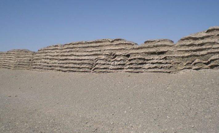 敦煌漢塞沿疏勒河南岸,由東向西延伸。西漢的塞墻止于疏勒河下游榆樹泉盆地東側的馬迷兔,在現(xiàn)敦煌市境內長約 145公里,其間有大、小方盤城和馬圈灣等烽燧遺址,一般保存較好。塞墻構筑多因地制宜,就地取材。在湖灘、沼澤地區(qū),塞墻多先以蘆葦束作框架,內填砂礫,再平鋪蘆葦層,如此層層疊壓而上,底寬約 3米,頂寬約1.5米,現(xiàn)存最高者約3.75米。戈壁地區(qū)多產(chǎn)紅柳,則以紅柳枝束為框架,筑法與蘆葦作材料者相同。