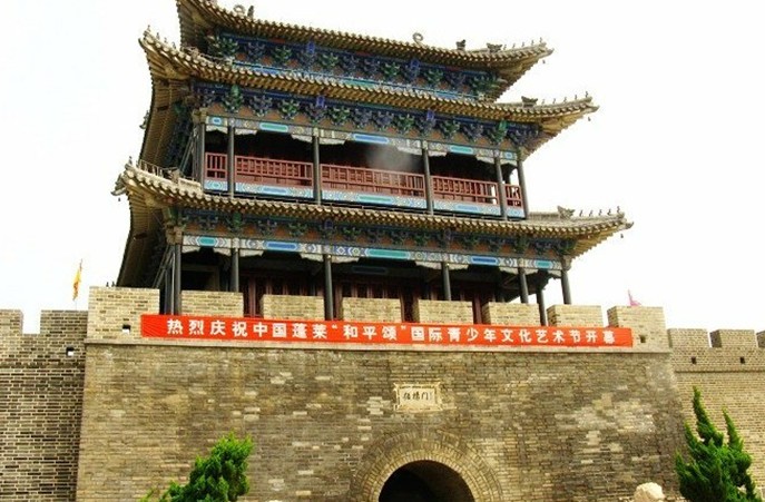 振揚(yáng)門(mén)為蓬萊水城南門(mén),坐北朝南,建于明洪武九年。1987年修復(fù),門(mén)洞拱頂,寬3米,高5.3米,進(jìn)深13.75米,門(mén)洞上方嵌“振揚(yáng)門(mén)”匾額,字為吳作人手筆。