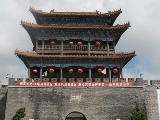 1987年修復(fù),門(mén)洞拱頂,寬3米,高5.3米,進(jìn)深13.75米,門(mén)洞上方嵌“振揚(yáng)門(mén)”匾額,字為吳作人手筆。門(mén)樓為兩層閣樓,外觀(guān)三層飛檐(俗稱(chēng)“三滴水”),屋面開(kāi)山,覆琉璃瓦,脊置六獸,檐角下系風(fēng)鈴,門(mén)樓四周為明廊,一層底面與城墻齊高,南北明廊外側(cè)為城堞,二層重檐,明廊柱間有木欄環(huán)繞。振揚(yáng)門(mén)兩側(cè)各修復(fù)城墻約50米,門(mén)前建有5000平方米廣場(chǎng)。自1989年始,每年的蓬萊經(jīng)貿(mào)懇談會(huì)開(kāi)幕式均在此舉行。1991年世界旅游日登州古市慶典活動(dòng)亦在此舉行迎賓儀式。
