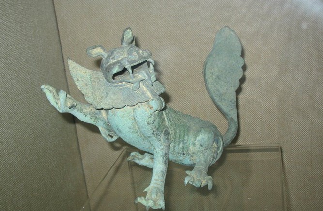 青銅大鐃 西周。高76.8厘米、甬長29.8厘米,重100.35千克。20世紀(jì)70年代出土。大鐃為雙范合鑄,兩面各有18個乳突狀枚。器體布滿以云雷紋為主的紋飾,甬的上半部兩面各飾有獸目一對,與云雷紋組成變體獸面紋。旋帶以細(xì)云雷紋為地,飾突出的勾連C形紋。舞面飾對稱的粗云雷紋四組。鐘面飾粗大深刻的云雷紋,只鼓部中央的隧部略高起,上飾淺細(xì)的圖案化獸面紋。該鐃形體之巨大,紋飾之精美,在國內(nèi)都屬罕見。