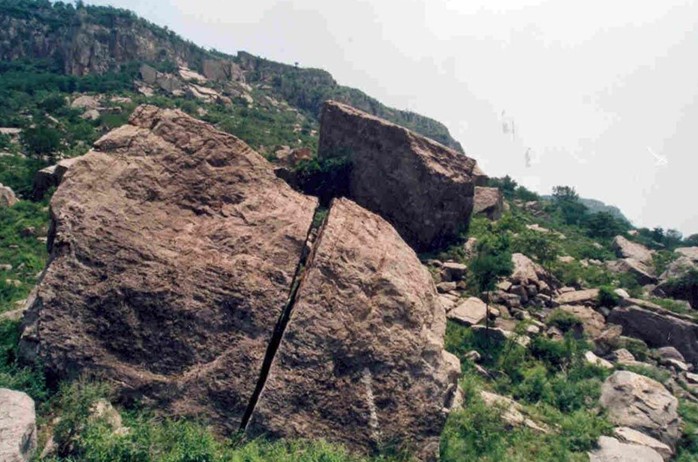 據(jù)地質(zhì)專家初步考證認(rèn)為:這種崩塌現(xiàn)象是300年前發(fā)生的郯城大地震引發(fā)了此處的大山崩而造成的。站在巨石之上,閉目凝神,300年前那山崩地裂的轟鳴聲仿佛仍然在耳畔回響。傳說山腳下曾有一個小村莊在一夜之間被巨石淹沒,除了一位外出遛鄉(xiāng)的貨郎和一只躲在地窖里的貓幸免于難外,其他生靈全部葬身石下。