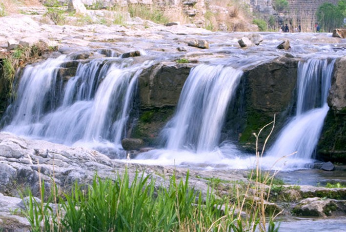 從這里往下游不到一里地,是“土泉瀑布”,它是峨莊瀑布群中最大的一個(gè)瀑布。巨大的水流從十幾米高的壩上泄到河岸的亂石上,激起的浪花又形成了許多樣式不同、大小不一的瀑布,最后跌落在山谷里。這些瀑布因自然地勢(shì)不同上承下接,形成了層層疊疊的小瀑布,連成一片,大珠小珠落玉盤,非常壯觀。這里是吸引游人最多的地方,為了便于觀賞,在下邊的河谷中建起了三個(gè)觀瀑亭,站在觀瀑亭上抬頭望去,還真有點(diǎn)“遙看瀑布掛前川”的味道。