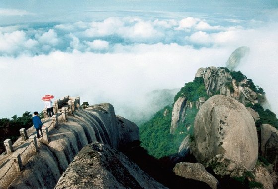 登上天池峰頂,可以領(lǐng)略一下“會當(dāng)凌絕頂,一覽眾山小”的氣概。這里視野寬闊無比,景色十分壯麗。是觀日出、云海、佛光、晚霞的最佳方位。天晴之時,極目遠眺,飛來峰、銜珠峰,五指峰,山連天際;煉丹湖如同一面銀光閃閃的鏡子被潛河、皖水兩條銀鏈夾在中間;大龍窩、后山、東關(guān)諸峰如同一個個土丘,盡收眼底。