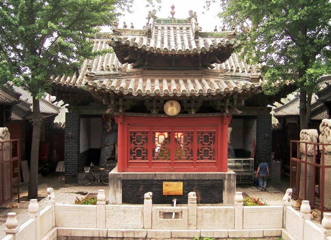 前院中央是靈泉,為孝婦河的主要源頭。呈7.5米見方的正方形,深3米,四周護(hù)有獸雕石欄。泉旁有一石碣題云:“孝婦河名自古今,泉頭一派更弘深。何當(dāng)汲去為霖雨,洗盡人間不孝心”?,F(xiàn)泉已干涸,改為人工泉水循環(huán)池內(nèi)。