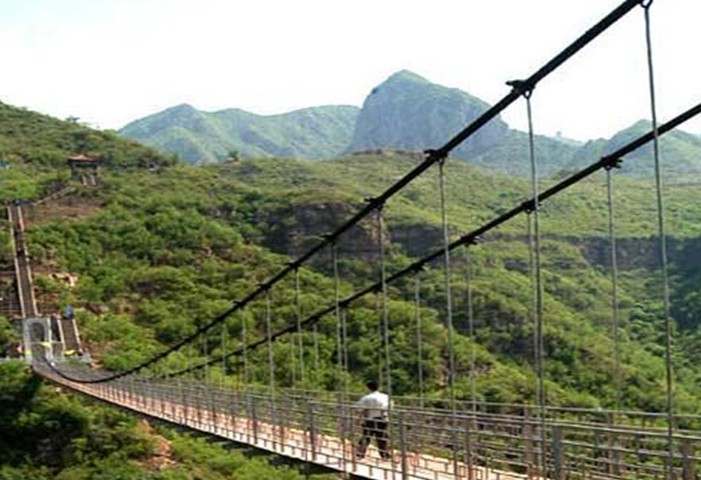 過了孝子祠,梓童湖如一面明鏡呈現(xiàn)在人們面前,在湖水上空架設(shè)了一座獨(dú)特的連接孝子祠與鬼谷祠的鐵索木橋,該橋全長50余米,寬2米有余,跨離水面10余米的兩岸懸崖之間,地部整齊地齊地橫臥5條大鐵鏈,上鋪木板,兩側(cè)設(shè)有固定拉鏈扶手,人行走在橋上好像步入顫悠悠、輕飄飄的云霧之中,思維升華,如登仙境。