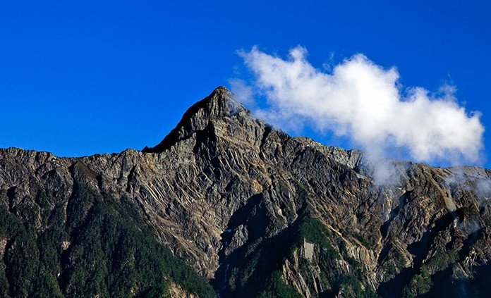 經(jīng)科學家們考察認定,玉山是水成巖山脈,地貌奇特,地層褶曲,使峰頂形似波濤,加上風雨侵蝕,砂巖、頁巖崎嶇急斜,容貌與一般山景迥然不同。突兀崢嶸,高插云天,四季積雪不化,成為四季常綠的臺灣島上的奇異景觀。
