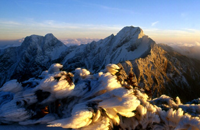 主峰玉山海拔3997米,為臺灣第一高峰。因常年積雪,遠望如玉,南、西、北四座高峰,人稱“五岳朝天”。玉山之美,美在它的奇峰。主峰挺拔、高峻,山容山勢具王者之尊。站在山巔向四周眺望;北面雪山、南湖大山、中央尖山;南面關(guān)山、北大武山,遍覽無遺;清晰可數(shù)。真有“會當凌絕頂,一覽眾山小”之感,俯視全省,群山如丘,河溪如帶;遠望太平洋,回顧臺灣海峽,只見無窮蔚藍空碧,仿佛天地相接,直覺浩氣充溢心胸。