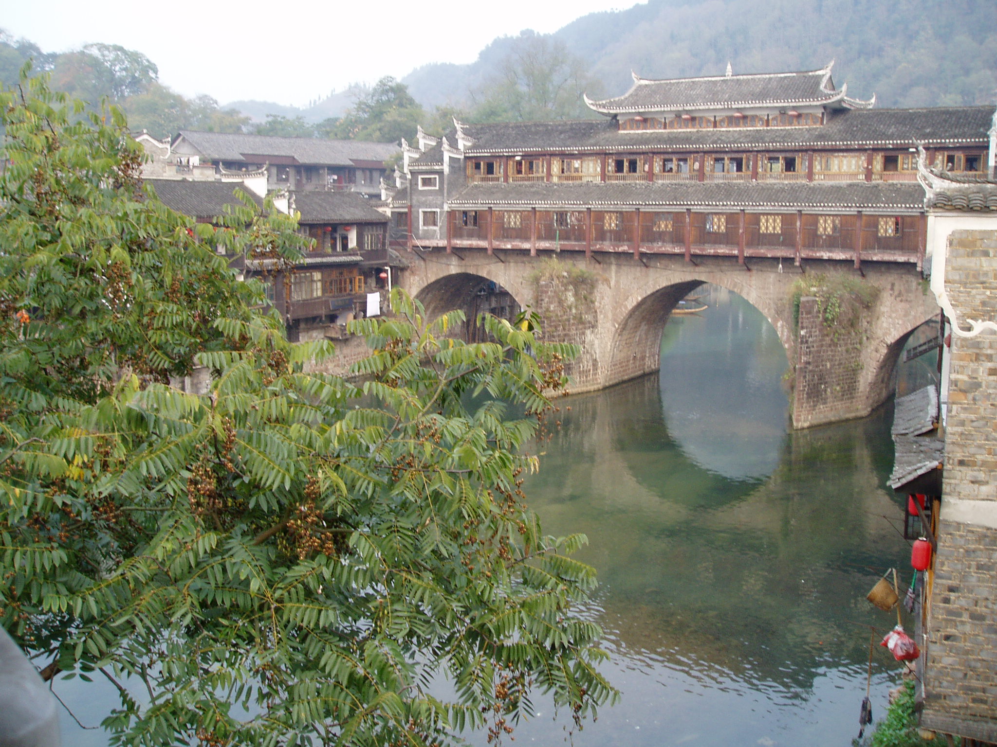 虹橋橫臥于沱江之上,風(fēng)雨樓以它的壯觀和俊美拔然而起,這其實(shí)就是成了一道重疊的風(fēng)景,這道風(fēng)景,由下而上、由古而今穿越著六百多年的歷史。 這座橋始建于明洪武初年,頗信風(fēng)水的鳳凰人都說,這座橋斬?cái)嗟氖且粭l龍頸,令一條巨龍身首異處。怪只怪那位和尚出生的安徽小子朱元璋,聽信一位從昆侖山開始追索一支龍脈,經(jīng)云貴高原來到五寨司城的陰陽先生的讒言,說這兒屏立南郊?xì)鈩莘欠驳哪先A山和與之一脈相承一頭扎入沱江的奇峰,就是他要尋找的龍頭。并由此推斷出總有一天這地方會有人出來問鼎中原,真命天子將出。那位朱皇帝豈能允許邊遠(yuǎn)的鳳凰有他潛在的對頭于是朱筆一勾,龍頸被斬,鳳凰風(fēng)水遭毀滅性破壞,鳳凰再也出不來皇帝了。