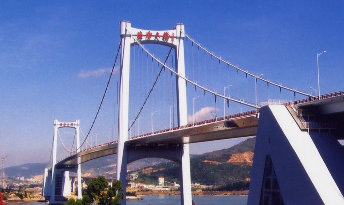 廈門海滄大橋是世界第二、亞洲第一座特大型三跨連續(xù)全漂浮鋼箱梁懸索橋,也是廈門市歷史上投資最大的交通工程項(xiàng)目,工程全長(zhǎng)5926.527米,主跨648米,海滄大橋設(shè)計(jì)通行能力為50000輛/日,行車時(shí)速為80公里/時(shí),工程概算總投資28.7億人民幣。海滄大橋工程于1996年12月18日破土動(dòng)工,主體工程于1997年6月份正式開(kāi)工建設(shè),全橋于1999年12月30日順利通車。