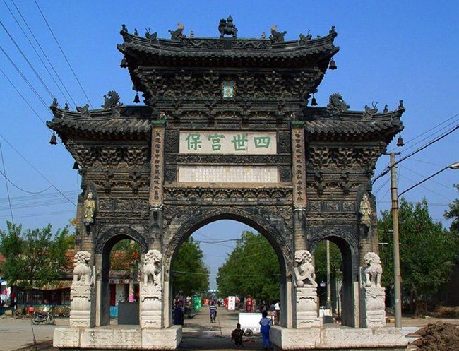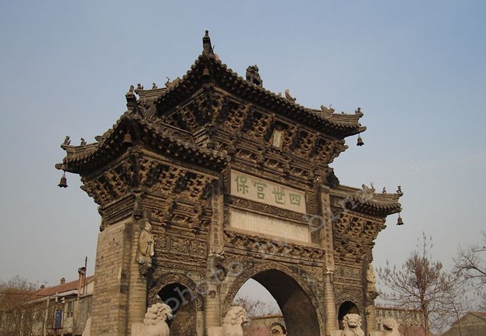 “ 四世宮保” 磚牌坊,面向南北,跨街而立,該坊為磚石結(jié)構(gòu),以磚為主。坊高 15 米,面寬 9.2 米 , 進(jìn)深 3.3 米 , 占地面積約 30 余平方米 . 其形式為中間高 , 兩邊底的宮殿式樣。該坊自下而上的構(gòu)造是:最下面設(shè)基座,其基座橫跨于大街兩側(cè),由巨型方石砌成,分有上、中、下三層,每層四周均有精致的浮雕,底層雕有蓮瓣;中層雕有云朵;上層雕有龍駒、麒麟、松鹿、棄獅、靈芝、行云等走獸和景物,姿態(tài)萬(wàn)千,栩栩如生,基座之上,開(kāi)拱門(mén)三孔,中孔一洞大,橫跨約 4 米,可以行人通車(chē),左右兩洞小,寬約兩米,對(duì)稱(chēng)和諧。各門(mén)楣雕有二龍戲珠,活靈活現(xiàn)。尤其是拱門(mén)兩側(cè),世石基座上雕刻的 8 尊石獅,分距前后兩面,雌雄各 4 ,各見(jiàn)情態(tài),生動(dòng)活潑。雄獅是按銹球,回首張望,雄姿勃發(fā);雌獅撫抱幼獅,俯首凝望,極盡母愛(ài)之情。中間大拱門(mén)之上,鑲嵌有上、下兩塊橫幅石匾,下為敘功匾、鐫刻著王氏祖孫四代的名瑋、職銜和誥贈(zèng)。敘功匾以上之匾額,鐫有 " 四世宮保 "4 個(gè)大字,字體端正,筆力遒勁,相傳是明代大書(shū)法家董其昌書(shū)寫(xiě)。
