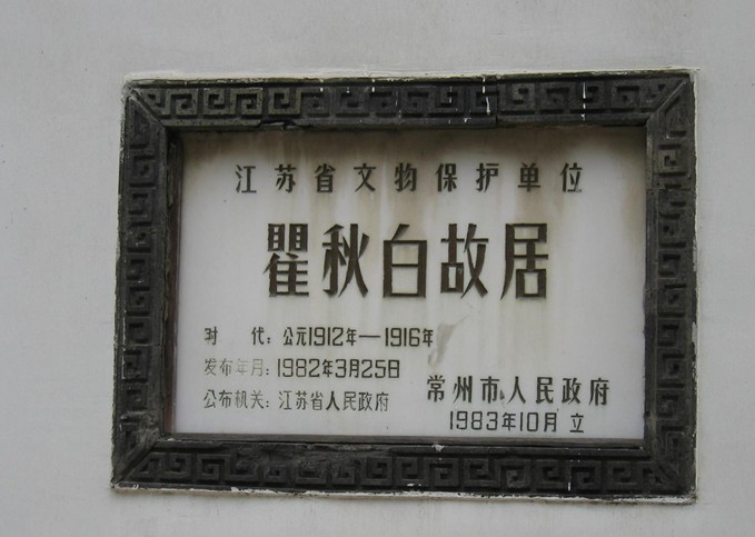 瞿秋白故居,于1982年3月25日由江蘇省人民政府公布為江蘇省文物保護(hù)單位。經(jīng)中共中央宣傳部批準(zhǔn)。于1985年6月18日瞿秋白同志英勇就義50周年紀(jì)念日正式對(duì)外開放。紀(jì)念館門樓下的金字橫匾“瞿秋白同志紀(jì)念館”系鄧小平同志書寫?;娟惲小饿那锇咨绞论E展覽》在西院,《瞿秋白故居陳列》在東院。并推出《紀(jì)念瞿秋白書畫展》等專題陳列。