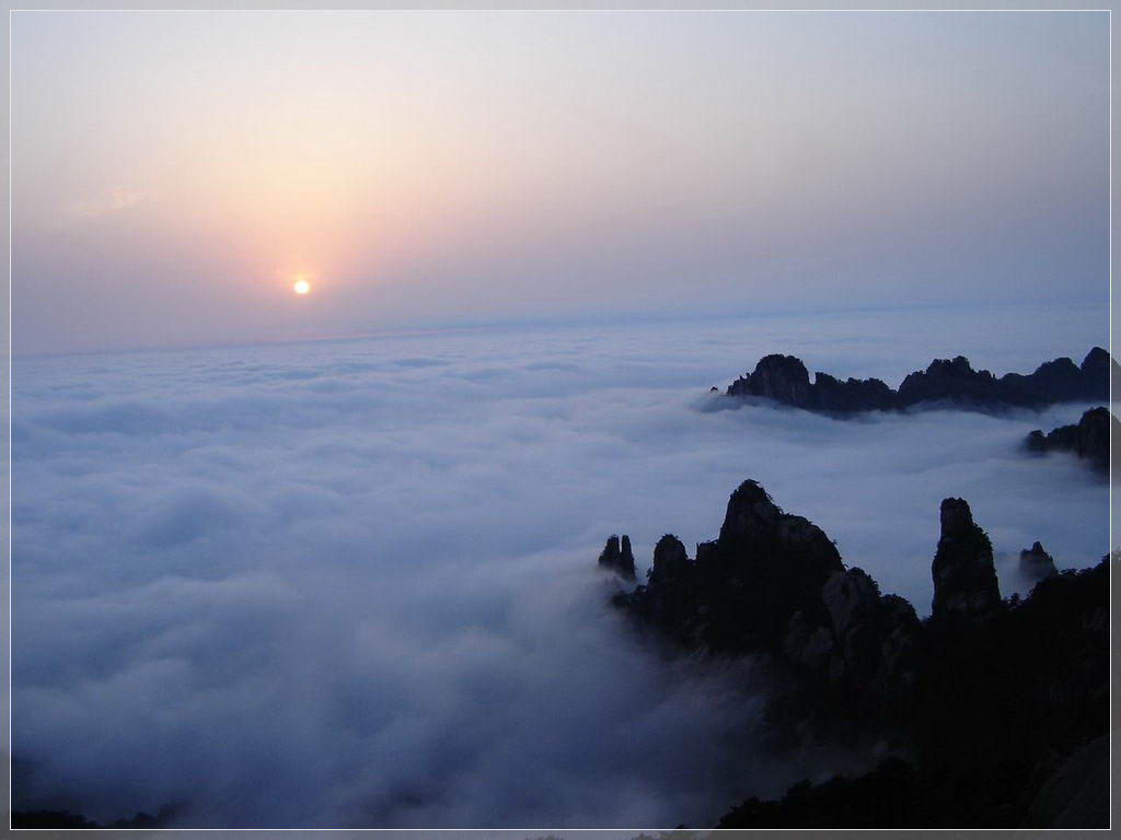 大凡高山,可以見到云海,但是黃山的云海更有其特色,奇峰怪石和古松隱現(xiàn)云海之中,就更增加了美感。黃山一年之中有云霧的天氣達(dá)200多天,水氣升騰或雨后霧氣未消,就會(huì)形成云海,波瀾壯闊,一望無(wú)邊,黃山大小山峰、千溝萬(wàn)壑都淹沒在云濤雪浪里,天都峰、光明頂也就成了浩瀚云海中的孤島。陽(yáng)光照耀,云更白,松更翠,石更奇。流云散落在諸峰之間,云來霧去,變化莫測(cè)。風(fēng)平浪靜時(shí),云海一鋪萬(wàn)頃,波平如鏡,映出山影如畫,遠(yuǎn)處天高海闊,峰頭似扁舟輕搖,近處仿佛觸手可及,不禁想掬起一捧云來感受它的溫柔質(zhì)感。忽而,風(fēng)起云涌,波濤滾滾,奔涌如潮,浩浩蕩蕩,更有飛流直瀉,白浪排空,驚濤拍岸,似千軍萬(wàn)馬席卷群峰。待到微風(fēng)輕拂,四方云慢,涓涓細(xì)流,從群峰之間穿隙而過;云海漸散,清淡處,一線陽(yáng)光灑金繪彩,濃重處,升騰跌宕稍縱即逝。云海日出,日落云海,萬(wàn)道霞光,絢麗繽紛。