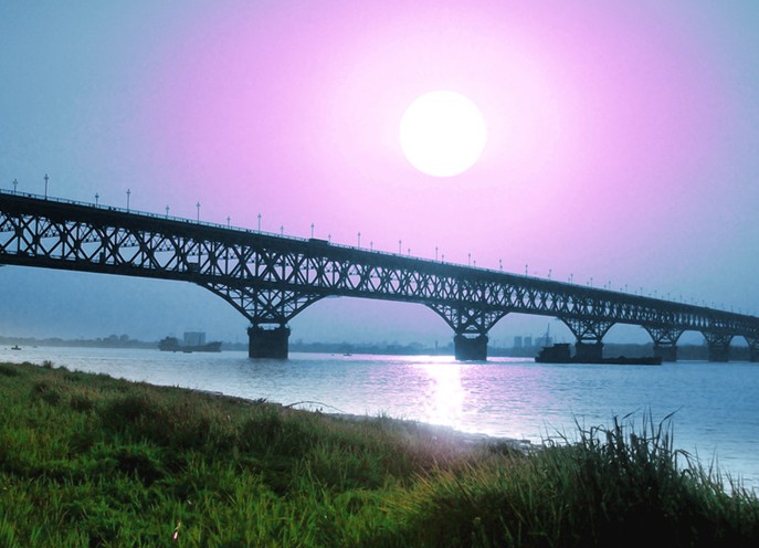 南京長江大橋,位于南京市西北面長江上,連通市區(qū)與浦口區(qū),是長江上第一座由我國自行設(shè)計建造的雙層式鐵路、公路兩用橋梁。上層的公路橋長4589米,車行道寬15米,可容4輛大型汽車并行,兩側(cè)還各有2米多寬的人行道;下層的鐵路橋長6772米,寬14米,鋪有雙軌,兩列火車可同時對開。其中江面上的正橋長1577米,其余為引橋,是我國橋梁之最。正橋的路欄上,公路引橋采用富有中國特色的雙孔雙曲拱橋形式。公路正橋兩邊的欄桿上嵌著200幅鑄鐵浮雕,人行道旁還有150對白玉蘭花形的路燈。