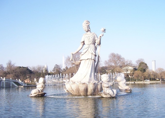 從玄武門開(kāi)始,一條形如玉環(huán)的陸地,從南北兩面深入湖中,即為環(huán)洲。步入環(huán)洲,碧波拍浪。細(xì)柳依依,微風(fēng)拂來(lái),宛如煙云舒卷,故有“環(huán)洲煙柳”之稱。洲南端假山瀑布盡顯江南園林美感,石峰中有形似觀音的觀音石,是宋代花石綱的遺物。過(guò)觀音石,有東晉文學(xué)家郭璞的衣冠冢。洲北岸蓮花港畔有喇嘛廟、諾那塔、湖光塔影,獨(dú)具幽情。湖上還有月季園、兒童樂(lè)園、兒童友誼樂(lè)園、登月火箭等游樂(lè)點(diǎn)。