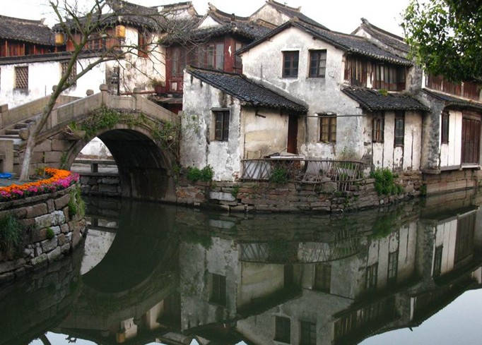 史載于1086年的古鎮(zhèn)周莊,位于上海、蘇州、杭州之間。鎮(zhèn)為澤國(guó),四面環(huán)水,咫尺往來(lái),皆須舟楫。全鎮(zhèn)依河成街,橋街相連,深宅大院,重脊高檐,河埠廊坊,過(guò)街騎樓,穿竹石欄,臨河水閣,一派古樸幽靜,是江南典型的小橋流水人家。