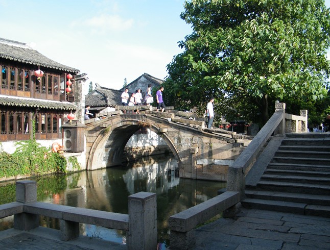 周莊在蘇州管轄的昆山之西南,周莊古稱貞豐里。北宋年間,周迪功朗(官名)在此辟田設(shè)莊,于宋元佑元年(1086年)舍田宅200余畝捐于當(dāng)?shù)厝K?,遂有周莊之稱。而正式定名為周莊鎮(zhèn),周莊卻是在清康熙初年。周莊位于上海、蘇州之間的江南水鄉(xiāng)腹地。贊美的人說(shuō)那里是鎮(zhèn)為澤國(guó),四面環(huán)水,港汊分歧,湖河聯(lián)絡(luò),咫尺往來(lái),皆須舟楫。宛如一顆鑲嵌在淀山湖畔的明珠。近日更因著名畫(huà)家陳逸飛將周莊畫(huà)入油畫(huà)中,在美國(guó)鈕約拍賣(mài)得了好價(jià)錢(qián)。人們紛紛要追尋這江南水鄉(xiāng)美景,老外紛至沓來(lái),周莊一時(shí)成了旅游熱線。