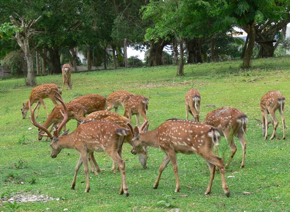 該場(chǎng)占地380多畝,60年代建成,至今已有700多只坡鹿、水鹿、馬鹿、梅花鹿、糜鹿、黃鹿嬉戲在椰林搖翠、芳草如茵的樂土上。這里,美麗的湖水,綠色的原野,設(shè)計(jì)奇妙的建筑,加上已經(jīng)馴化、可人心意的鹿群,構(gòu)成美妙有趣的童話世界。在鹿場(chǎng),你可購一些紅薯片喂鹿逗趣,還可以摟鹿親親熱熱拍一張溫情脈脈的合影,讓你的朋友吃上半兩老陳醋。