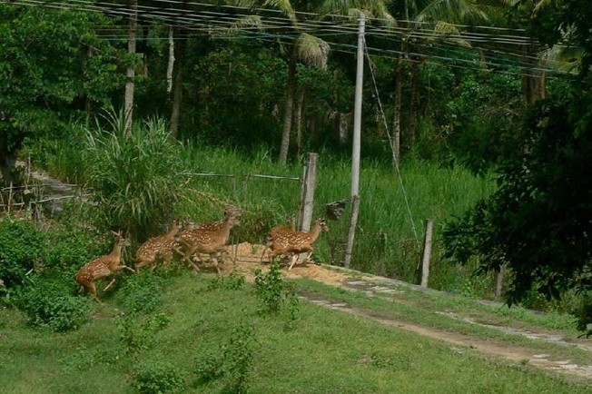 海榆公路中線111公里處,屯昌縣木色木庫三面臨水的半島上,便是目前中國南方最大的綜合性養(yǎng)鹿場(chǎng)之 一——楓木鹿場(chǎng)。 該場(chǎng)占地380多畝,60年代建成,至今已有700多只坡鹿、水鹿、馬鹿、梅花鹿、糜鹿、黃鹿嬉戲在椰林搖翠、芳草如茵的樂土上。這里,美麗的湖水,綠色的原野,設(shè)計(jì)奇妙的建筑,加上已經(jīng)馴化、可人心意的鹿群,構(gòu)成美妙有趣的童話世界。