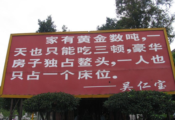 華西村的領頭人----村黨委書記吳仁寶的語錄與總書記江澤民的語錄并排矗立。語錄告誡干部們既要與黨中央保持一致,又要與人民群眾保持一致;勸說人們家有黃金萬兩,一日不過三餐,住房獨占鰲頭,也只睡一個人的位置。