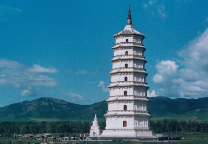 遼釋迦佛舍利塔,俗稱遼慶州白塔,當(dāng)?shù)孛晒抛迥撩駛兎Q“金金察罕索布爾嘎”,位于內(nèi)蒙古自治區(qū)巴林右旗索博日嘎蘇木駐地東北查干沐淪河的沖積平原上,是遼代鼎盛時(shí)期的重要州城———慶州城西北部,為第三批國(guó)家重點(diǎn)文物保護(hù)單位。