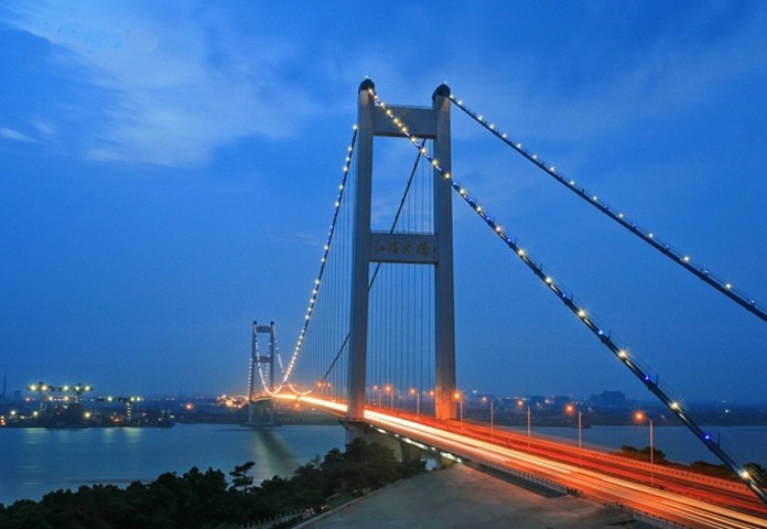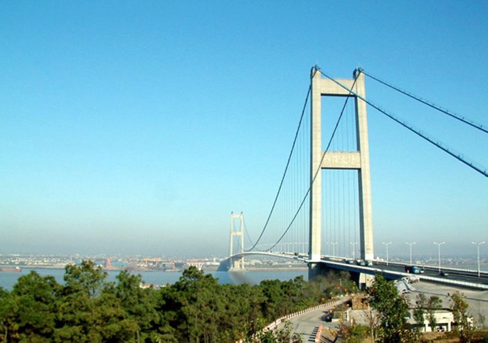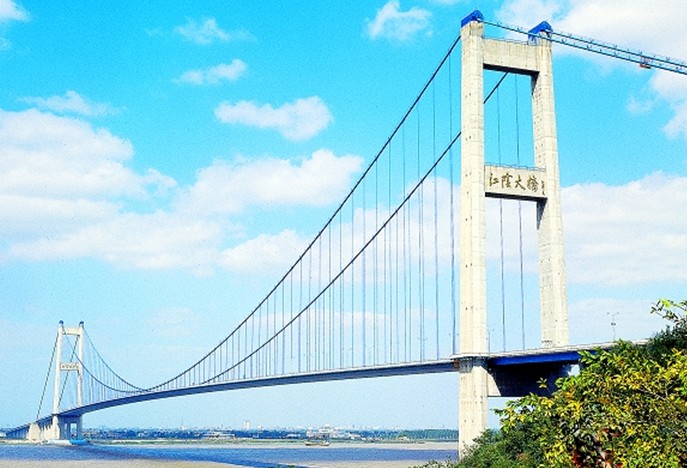江陰長江公路大橋,位于江蘇省江陰市黃田港以東3200米的西山,橋型采用主跨為1,385m鋼懸索橋。為世界第四、中國第一大橋。1994年開工建設(shè),1999年10月建成通車。