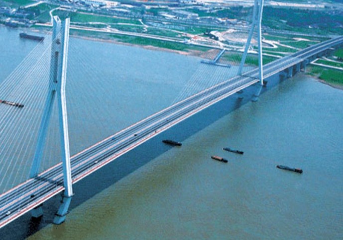 江陰長江公路大橋,懸索橋結(jié)構(gòu)。主跨1385m。門式鋼筋混凝土塔柱,柱高193m,中設(shè)橫梁三道。為目前世界第6、中國第3大橋。94年開工建設(shè),99年10月建成通車。