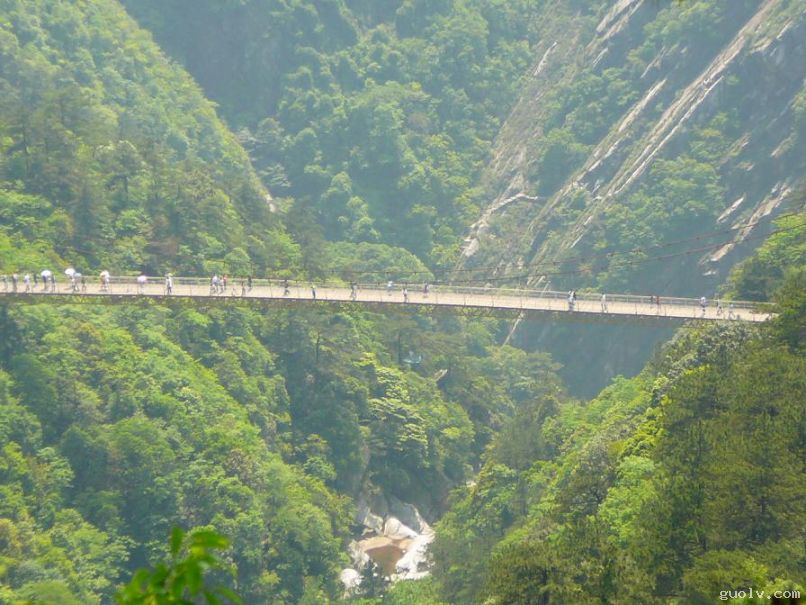 三疊泉位于五老峰下部,飛瀑流經(jīng)的峭壁有三級,溪水分三疊泉飛瀉而下,落差共155米,極為壯觀,撼人魂魄。 三疊泉每疊各具特色。一疊直垂,水從20多米的巔萁背上一傾而下;二疊彎曲,直入潭中?!吧霞壢顼h雪拖練,中級如碎玉摧冰,下級如玉龍走潭?!?站在第三疊抬頭仰望,三疊泉拋珠濺玉,宛如白鷺千片,上下爭飛;又如百副冰綃,抖騰長空,萬斛明珠,九天飛灑。如果是暮春初夏多雨季節(jié),飛瀑如發(fā)怒的玉龍,沖破青天,凌空飛下,雷聲轟鳴,令人嘆為觀之。(三疊泉門票64元/人)