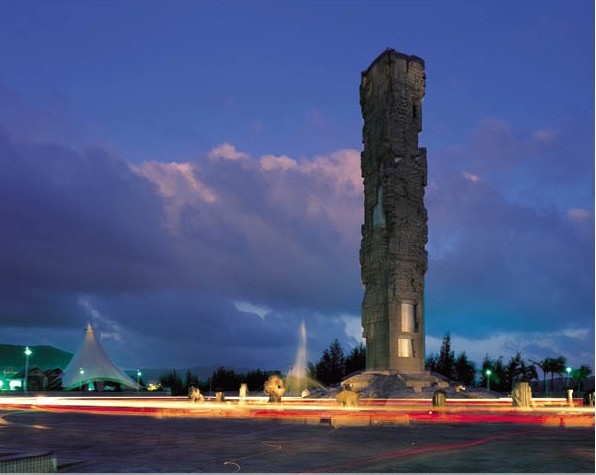 圍繞圖騰柱的中心雕塑區(qū),形成三圈石硨,氣勢宏大、形象獨特。第一圈有蒼龍、白虎、朱雀、玄武四季標識與日晷24節(jié)氣雕塑;第二圈表現(xiàn)盤古開天地、女媧補天、嫦娥奔月、弄天舞干戚、大禹治水、牛郎織女、后羿射日、夸父追日等八個遠古神話;第三圈是反映天文、人、動物、植物萬物生靈雕刻。圖騰柱和雕塑群渾然一體,構(gòu)成強烈的中國古天文意識和東方神秘色彩。廣場外圍設(shè)計的五組白色風(fēng)帆式的尖頂帳篷及大型彩色噴泉,給具有古老文化意蘊的雕塑增添了現(xiàn)代氣息。