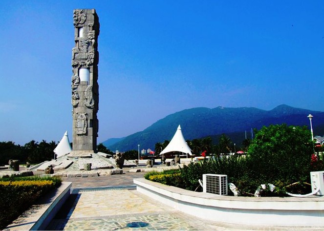 亞龍灣中心廣場,位于三亞市東南28公里處。廣場以圖騰柱向藍天升騰,以雕塑群向大地和大海延伸,其宏偉氣勢和獨特的藝術(shù)造型,以有限的藝術(shù)空間形式,引導(dǎo)我們的想象向無限的空間擴展。屹立的圖騰柱是廣場的最高點,高26.8米,由200多塊巨大的花崗石和直徑2.5米的鋁合金柱組成。上面雕刻有龍、鳳、太陽鳥、魚以及風(fēng)雨雷電四神的圖案。 圍繞圖騰柱的中心雕塑區(qū),形成三圈石硨,氣勢宏大、形象獨特:第一圈有蒼龍、白虎、朱雀、玄武四季標識與日晷24節(jié)氣雕塑;第二圈表現(xiàn)盤古開天地、女媧補天、嫦娥奔月、弄天舞干戚、大禹治水、牛郎織女、后羿射日、夸父追日等八個遠古神話;第三圈反映天文、人、動物、植物萬物生靈及八位中國古代之神。圖騰柱和雕塑群渾然一體,構(gòu)成強烈的中國古天文意識和東方神秘色彩。廣場外圍設(shè)計的五組白色風(fēng)帆式的尖頂帳篷及大型彩色噴泉,給具有古老文化意蘊的雕塑增添了現(xiàn)代氣息。