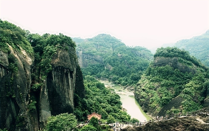 曲折縈回的九曲溪貫穿于丹崖群峰之間,如玉帶串珍珠,將36峰、99巖連為一體。山臨水而立,水繞山而行,峰巖高低、河床寬窄、曲率大小、水流急緩、視域大小、視角仰俯等都達(dá)到絕妙的程度,構(gòu)成“一溪貫群山,兩巖列仙岫”的獨(dú)特美景,溪光山色中溶注了中國(guó)傳統(tǒng)的詩(shī)情畫意和美學(xué)意境。登山可覽碧水清溪,涉水能看奇峰異石,乘一葉古樸竹筏順溪而下,可賞奇拔秀偉、千姿百態(tài)、爭(zhēng)奇斗妍的形象美;可品泉歌鳥(niǎo)鳴、浪擊輕舟、篙點(diǎn)褐石、綠樹(shù)紅花的色彩美;可看流水游魚、浮云飛鳥(niǎo)、艄公游人的動(dòng)態(tài)美;可睹云繞山嶂、霧鎖峰腰、雨罩群峰的朦朧美,身臨秀色美景,猶如漫步奇幻百出的山水畫廊,聆聽(tīng)豐富有變奏的交響樂(lè)章,欣賞韻味獨(dú)特的瑤池歌舞,品味韻律有致的美麗詩(shī)篇,如癡如醉,飄飄欲仙。這是武夷山自然景觀的精華,堪稱世界一絕。
