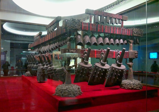 曾侯乙編鐘:時期為戰(zhàn)國時期,1978年湖北隨縣曾侯乙墓出土。鐘架長748厘米,高265厘米,重4.5噸左右。全套編鐘共六十五件,分三層,八組懸掛在呈曲尺形的銅木結構鐘架上。每件鐘均能奏出呈三度音階的雙音,全套鐘十二個半音齊奏,可以旋宮轉調。音階為現(xiàn)今通用的C大調,能演奏五聲、六聲或七聲音階樂曲。