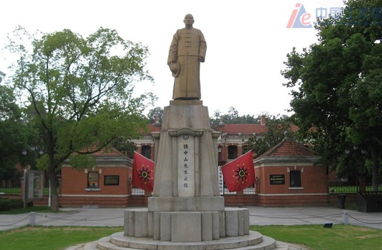大樓后方也是一座二層樓房。兩側(cè)各有一排紅色平房。正前方出口處裝有鐵柵大門,大門兩側(cè)為門房,由上半部裝有鐵柵的紅色矮墻自門房兩側(cè)平伸,與左右平房連接,圍成方形院落。舊址面對閱馬場,院門外正前方立有孫中山銅像,儀表莊嚴安詳。