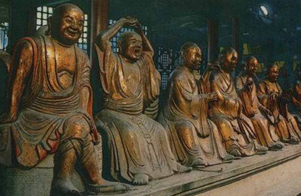 走進羅漢堂,無不被它們的生動形象所感染。只見有的盤腿端坐,有的臥石看天,有的研讀佛經,有的驅邪除惡。表情上,有的勇武,有的溫良,有的天真憨厚,有的飽經滄桑,個個維妙維肖,活靈活現(xiàn)。如第463尊羅漢是颯陀怒尊者,四周有6個童子,為羅漢挖耳、掩嘴、遮眼等,稱“六賊戲彌勒”。六賊即眼、耳、鼻、舌、身、意。它告誡佛門弟子,不要為凡情所染。塑像中把孩子的天真爛漫,嬌稚頑皮和羅漢的慈祥憨厚的神態(tài)刻化得淋漓盡致,讓人們從心底發(fā)出贊嘆的笑聲。