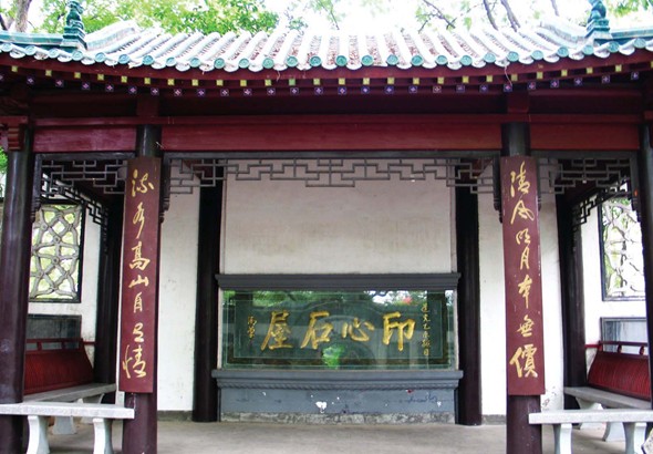 到游覽,進(jìn)大門,過小院,出茶院右門,迎門是置于黃瓦紅柱內(nèi)的清道光皇 帝御書“印心石屋”照壁,用陰陽筆法刻鐫而成,遠(yuǎn)看凸突而出,近看凹陷而入。照壁東側(cè)有一小門,門額“琴臺(tái)”二字,據(jù)傳出自北宋著名書法家米芾之手。再往前便是琴堂,又名友誼堂,是一棟半檐歇山頂式前加抱廈的殿堂,面寬三間,四周回廊,磚木架屋,釉瓦蓋頂,彩畫精麗,金碧輝煌。檐下匾額上書“高山流水”四字。