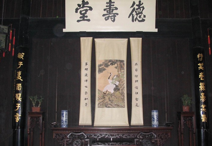 第二進為廳堂,俗稱“大堂前”,是周氏族人的公共活動場所,以作喜慶、祝福和宴會賓客之用。廳堂正上方高懸一塊大匾“德壽堂”,兩旁柱子上有一副紅底黑字的楹聯(lián):