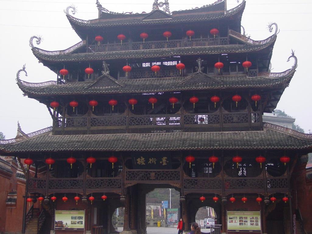 土司城門樓高25米,寬12米,是棟純粹榫卯結構的木樓。高大壯觀、結構精良;布局精巧合理。兩邊走馬轉角樓梯可盤旋至頂,層層相通相連。門樓門窗由200扇門,189塊鏤空雕花圖案組成,內容多為戲文及民間傳奇故事。有趣的是,整座門樓還隱含著許多奇巧而又寓意雙關的數字,如門樓高4層、12根柱、24根梁。那意味著什么呢?意味著一年中的4季、12個月和24個節(jié)氣。還有門樓屋頂上數只蝙蝠拱托著一枚古錢的裝飾雕塑,它叫"福在眼前"。福就是借指蝙蝠,錢就是那枚銅錢了。真算是無字勝似有字,于無聲處說吉祥了。