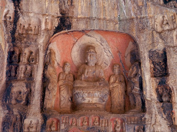 賓陽洞包括南洞、中洞和北洞,是北魏宣武帝為其父母孝文帝和文昭皇太后做功德所營造的洞窟之一。版權(quán)所有山東聊城聊之旅國際旅行社有限公司,轉(zhuǎn)載必究!其中僅中洞的開鑿就花費(fèi)了24年時間,其富麗堂皇的景象是龍門眾多石窟之冠。主佛釋迦牟尼端坐中央,面部修長清秀,面容和藹慈祥,略帶微笑。迦葉、阿難二弟子和文殊、普賢二菩薩侍立左右。迦葉形象老成持重,阿難形象活潑開朗,望之栩栩如生。佛像的衣飾都由北魏早期的袒露右肩和通肩式,變?yōu)榘虏?,是孝文帝?shí)行漢化政策在石刻藝術(shù)上的反映。洞頂?shù)裼猩徎▽毶w,周圍雕著飄逸脫俗的伎樂天人和供養(yǎng)天人。洞口內(nèi)壁兩側(cè)原本刻有三層大型浮雕,下層是著名的“皇帝禮佛圖”和“皇后禮佛圖”,構(gòu)圖嚴(yán)謹(jǐn),雕刻精美,是我國古代雕刻藝術(shù)的杰作??上н@兩幅珍品已于1934年被不法奸商盜往海外。后人已無緣得見,只能對著石壁而徒發(fā)感慨了。