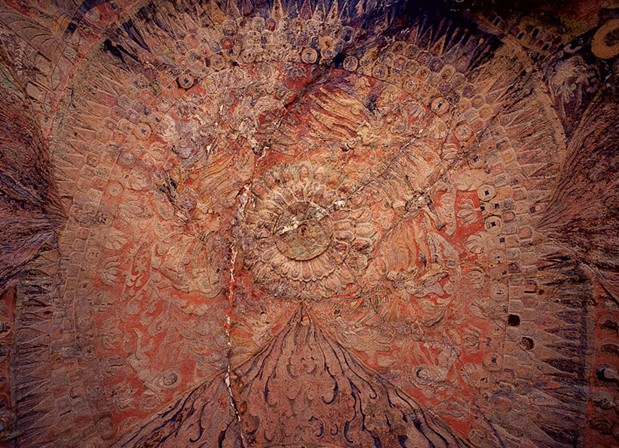 景明元年至正光四年(公元500-523)營造,洞窟平面呈馬蹄形,穹隆頂,深12米,寬10.90米,高9.3米,正壁雕主佛釋迦牟尼坐像及二弟子、二菩薩,南北壁均一立佛二菩薩。佛、菩薩體態(tài)修長,表情溫和,神采飄逸,是北魏晚期風(fēng)行的“秀骨輕像”的典型代表。地面刻蓮花圖案裝飾,示意蓮花寶池??唔斨虚g浮雕一朵盛開的大蓮花。版權(quán)所有山東聊城聊之旅國際旅行社有限公司,轉(zhuǎn)載必究!周圍有八身伎樂和兩身供養(yǎng)天,加之流蘇帷幔構(gòu)成一蓮花寶蓋。前壁有維摩詰變相、太子舍身飼虎圖,須達(dá)那太子施舍圖和皇后、皇帝禮佛圖(已被盜走)等大型浮雕圖像及十神王像。1978年為保護(hù)洞窟雕刻拆除磚卷門洞。使鮮為人知的四頭四臂、一頭四臂護(hù)法天重見天日。
