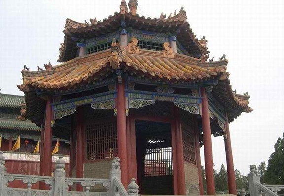 大殿前筑有3米高的月臺,周圍有石雕欄桿,月臺正面有三道石階。中間的臺階分二路,二路間鑲有垂帶式“御路”一石,上面浮雕著精美的圖案,上截為“獨(dú)龍盤踞”,中間為“雙龍戲珠”,下邊為“群鶴鬧蓮”等紋飾。月臺下面為拜臺,左右為兩座秀麗的御碑亭,東為“御捍亭”,內(nèi)立乾隆十五年(公元1750年)的御碑,西為“御帛亭”,內(nèi)立乾隆四十八年(公元1783年)的御碑,其字乃草書,筆勢如箭,揮灑淋離。