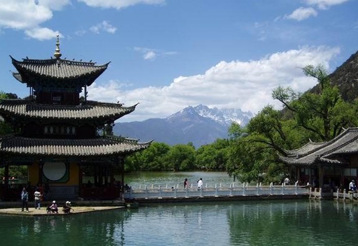 麗江黑龍?zhí)豆珗@俗稱龍王廟,位于麗江古城北端象山之麓。黑龍?zhí)秲?nèi)隨勢(shì)錯(cuò)落的古建筑有龍神祠、得月樓、鎖翠橋、玉皇閣和后來(lái)遷建于此的原明代芝山福國(guó)寺解脫林門(mén)樓、五鳳樓,原知府衙署的明代光碧樓及清代聽(tīng)鸝榭、一文亭、文明坊等建筑。