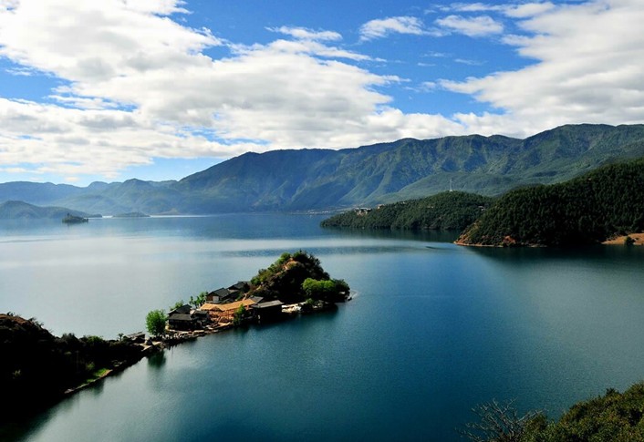瀘沽湖不僅水清,而且島美。瀘沽湖四周青山環(huán)抱,湖岸曲折多灣,共有17個(gè)沙灘、14個(gè)海灣;湖中散布5個(gè)全島、3個(gè)半島、1個(gè)海堤連島,一般高出水面15至30公尺,遠(yuǎn)看象一只只綠色的船,飄浮在湖面。其中,寧蒗一側(cè)的黑瓦吾島、里無(wú)比島和里格島,成為湖中最具觀賞和游覽價(jià)值的三個(gè)景點(diǎn),被譽(yù)為“瀘沽三島”。黑瓦吾島位于湖心,距離湖岸落水村2500米,島上樹(shù)術(shù)蔥籠,百鳥(niǎo)群集,是南來(lái)北往的候鳥(niǎo)、野鴨的棲息之處,也是昔日永寧土司阿云山總管的水上行宮,美國(guó)學(xué)者洛克也曾旅居于此。