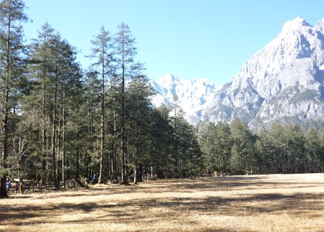 云杉坪,土語稱“游午閣”即“情死之地”又名錦繡谷,海拔3240米,是一塊隱藏在原始云杉林中的巨大草坪。位于玉龍雪山東麓的山箐里,在雪山主峰的右下方。