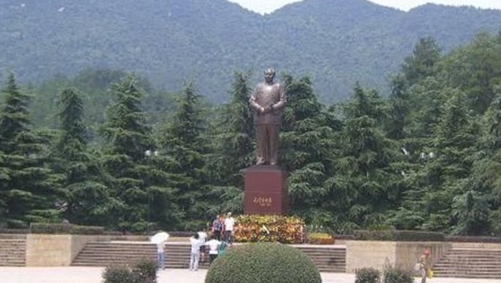 毛主席的銅像矗立在韶山?jīng)_廣場。這里背襯韶峰,是韶山?jīng)_的中心,對面就是毛氏宗祠和毛澤東紀念館。