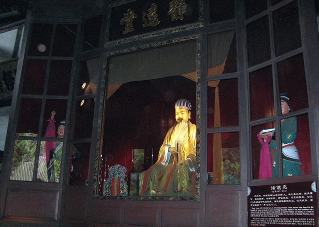 劉備殿后,下數(shù)節(jié)臺階(武侯祠低于漢昭烈廟,象征古代君臣關(guān)系),是一座過廳,掛有“武侯祠”匾額。武侯祠是紀(jì)念三國時蜀漢丞相武鄉(xiāng)侯諸葛亮的祠堂,諸葛亮生前封“武鄉(xiāng)侯”,死后謚號“忠武”,故紀(jì)念他的祠堂稱作“武侯祠”。諸葛亮殿懸“名垂宇宙”匾額,兩側(cè)為清人趙藩撰書“攻心”聯(lián):“能攻心則反側(cè)自消,自古知兵非好戰(zhàn);不審勢即寬嚴(yán)皆誤,后來治蜀要深思。”的聯(lián)文,是頗負(fù)盛名的一副對聯(lián),借對諸葛亮、蜀漢政權(quán)及劉璋政權(quán)的成敗得失的分析總結(jié),提醒后人在治蜀、治國時借鑒前人的經(jīng)驗(yàn)教訓(xùn),要特別注意“攻心”和“審勢”。正殿中供奉著諸葛亮祖孫三代的塑像。殿內(nèi)正中有諸葛亮頭戴綸巾、手執(zhí)羽扇的貼金塑像,像前的三面銅鼓相傳是諸葛亮帶兵南征時制作,人稱“諸葛鼓”。鼓上有精致的圖案花紋,為珍貴的歷史文物。大殿頂梁由烏木制成,上書諸葛亮寫給兒子諸葛瞻《誡子書》中“非澹泊無以明志,非寧靜無以致遠(yuǎn)”(不看輕世俗的名利就不能明確自己的志向,不是身心寧靜就不能實(shí)現(xiàn)遠(yuǎn)大的理想)。諸葛瞻及其子尚在綿竹抗擊魏將鄧艾的戰(zhàn)斗中不幸身亡。