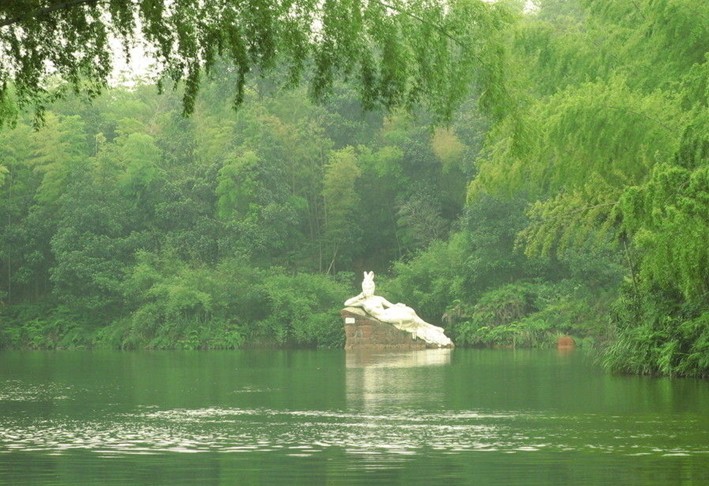 伐舟湖心,清涼的風(fēng)使人身心爽暢。竹筏揚(yáng)起的清清碧波,層層漣漪,漫連著四周碧的蕨綠的竹。湖的深處,瑤箐仙子正臨波浴身,她那流瀑般的秀發(fā)輕柔地披散在萬點(diǎn)柔光的碧波中,一雙白皙而修長的胳膊正掬起一抔瓊漿澆灑在秀美的臉頰上,珍珠般的水在她如雪似玉的肌膚上滾動,熠熠生輝。岸邊,臨水而建的竹亭、竹廊、竹寨,在翠竹的掩映下,絢麗多彩。