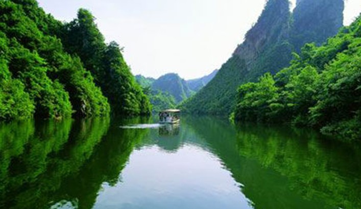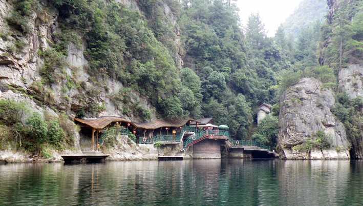 湖中有兩座疊翠小島,近岸奇峰屹立,峰回水轉(zhuǎn)。泛舟漫游,只見(jiàn)一湖綠水半湖倒影,充滿詩(shī)情畫意。“云梯萬(wàn)丈上天臺(tái),高峽平湖一鑒開(kāi),王母瑤池金扶,浣沙仙女下凡來(lái)”游寶峰湖,你就會(huì)欣賞到這樣的詩(shī)情畫意。群峰擁抱的寶峰湖,長(zhǎng)約2.,5公里,湖猶如一面寶鏡,四面青山,一泓碧水,蕩槳溫游,格外愜意。坐在船上,環(huán)顧四周,千山聳翠,俯視水中,倒影慢移,碧水照相館得群峰綠,人面桃花水映紅。真是靜極了,美極了!韓劇《九天洞》拍攝的湖水就是寶峰湖。